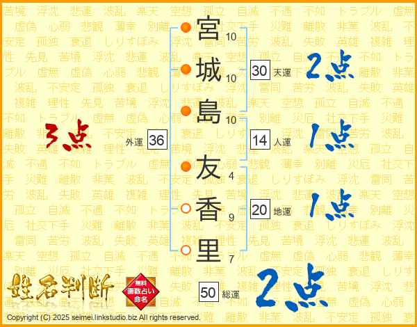 宮(10画)城(10画)島(10画) 友(4画)香(9画)里(7画)