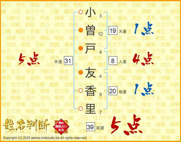 小(3画)曽(12画)戸(4画) 友(4画)香(9画)里(7画)