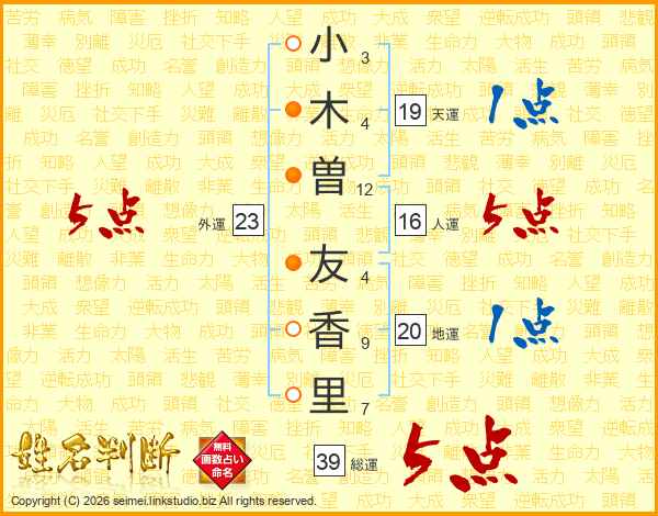 小(3画)木(4画)曽(12画) 友(4画)香(9画)里(7画)