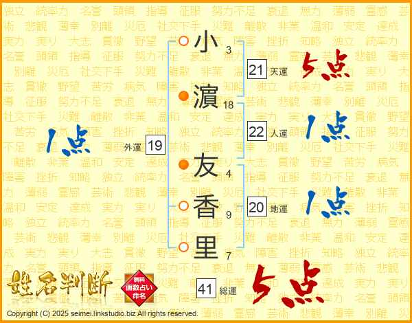 小(3画)濵(18画) 友(4画)香(9画)里(7画)
