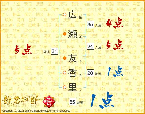 広(15画)瀬(20画) 友(4画)香(9画)里(7画)