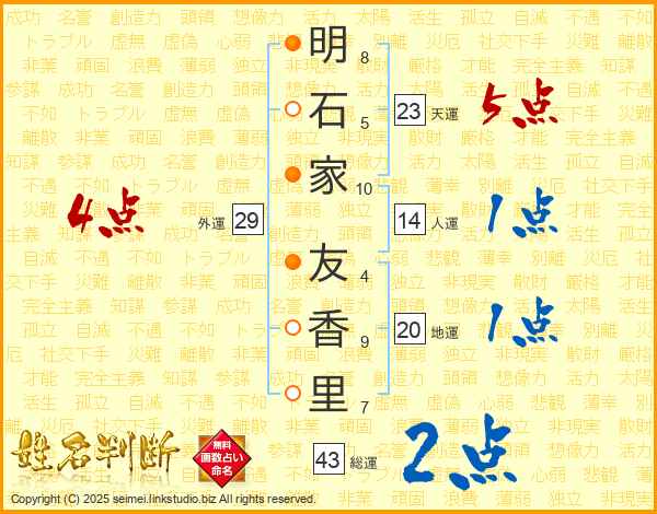 明(8画)石(5画)家(10画) 友(4画)香(9画)里(7画)