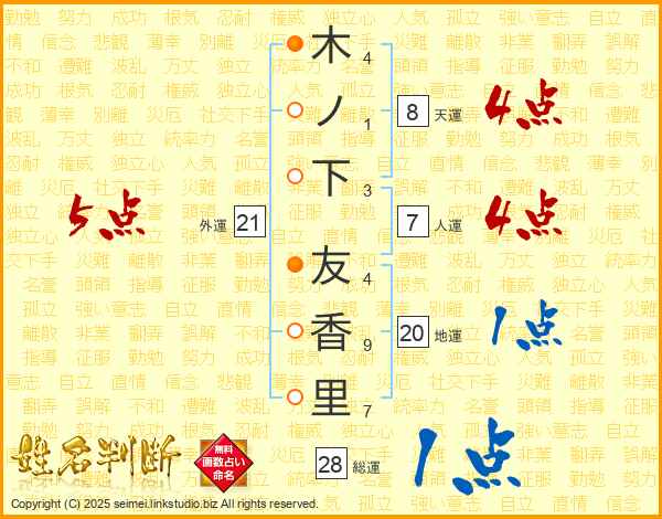木(4画)ノ(1画)下(3画) 友(4画)香(9画)里(7画)