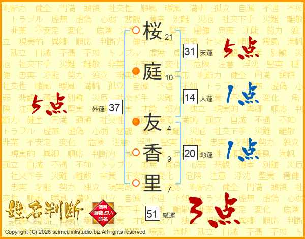 桜(21画)庭(10画) 友(4画)香(9画)里(7画)