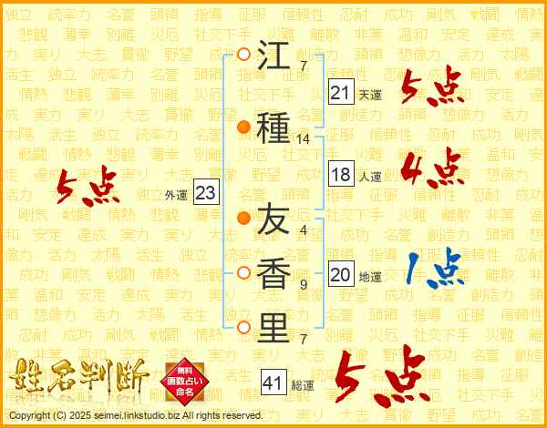 江(7画)種(14画) 友(4画)香(9画)里(7画)