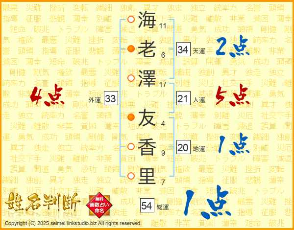 海(11画)老(6画)澤(17画) 友(4画)香(9画)里(7画)