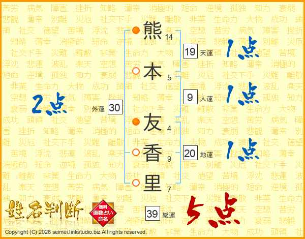 熊(14画)本(5画) 友(4画)香(9画)里(7画)