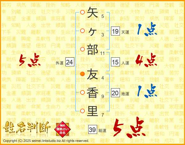 矢ヶ部友香里さんの総運は39画の5点!