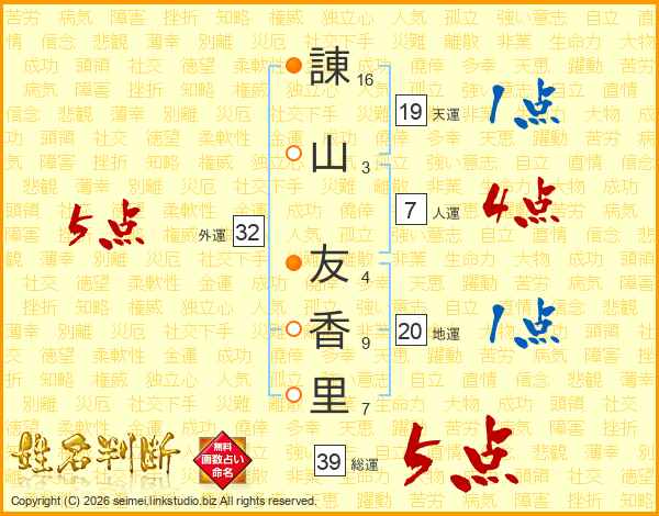 諌(16画)山(3画) 友(4画)香(9画)里(7画)