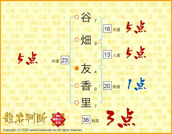 谷(7画)畑(9画) 友(4画)香(9画)里(7画)