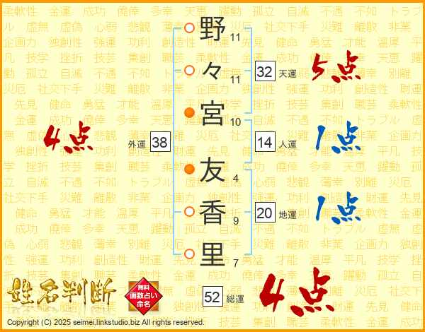 野(11画)々(11画)宮(10画) 友(4画)香(9画)里(7画)