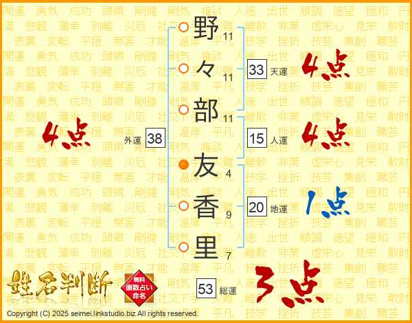 野(11画)々(11画)部(11画) 友(4画)香(9画)里(7画)