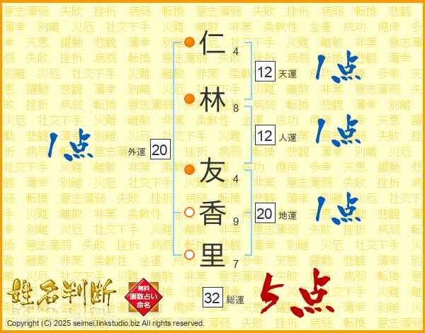 仁(4画)林(8画) 友(4画)香(9画)里(7画)