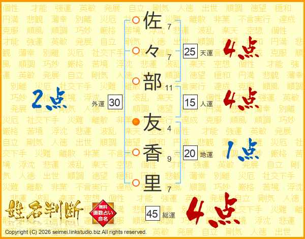 佐(7画)々(7画)部(11画) 友(4画)香(9画)里(7画)
