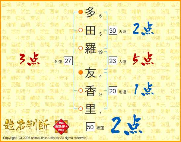 多(6画)田(5画)羅(19画) 友(4画)香(9画)里(7画)