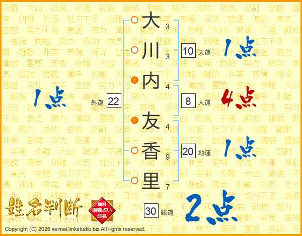 大(3画)川(3画)内(4画) 友(4画)香(9画)里(7画)