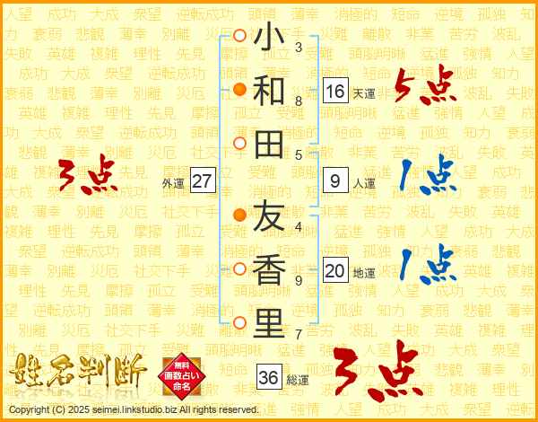 小(3画)和(8画)田(5画) 友(4画)香(9画)里(7画)