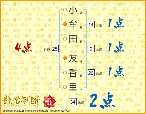 小(3画)牟(6画)田(5画) 友(4画)香(9画)里(7画)