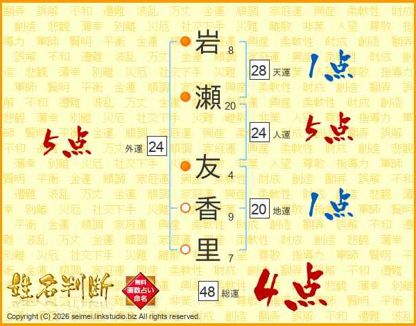岩(8画)瀬(20画) 友(4画)香(9画)里(7画)