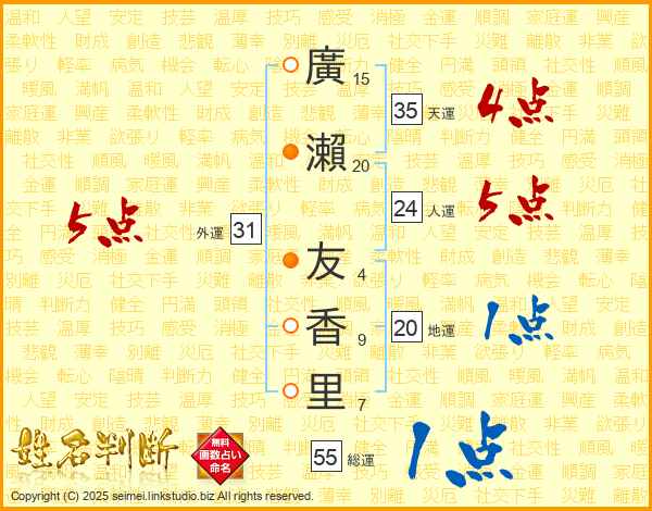 廣(15画)瀨(20画) 友(4画)香(9画)里(7画)