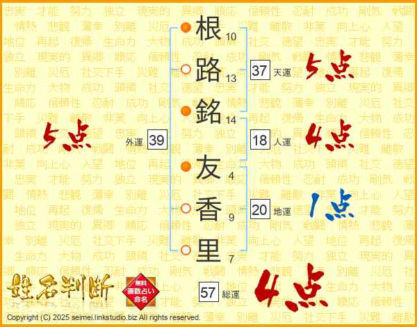 根(10画)路(13画)銘(14画) 友(4画)香(9画)里(7画)