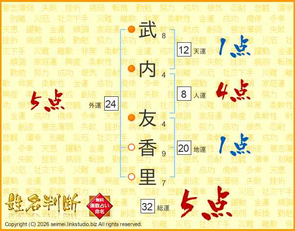 武(8画)内(4画) 友(4画)香(9画)里(7画)