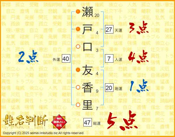 瀬(20画)戸(4画)口(3画) 友(4画)香(9画)里(7画)
