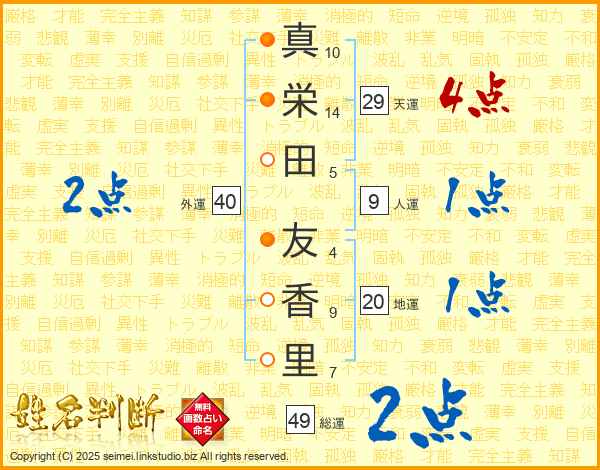 真(10画)栄(14画)田(5画) 友(4画)香(9画)里(7画)