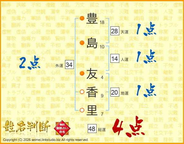 豊(18画)島(10画) 友(4画)香(9画)里(7画)