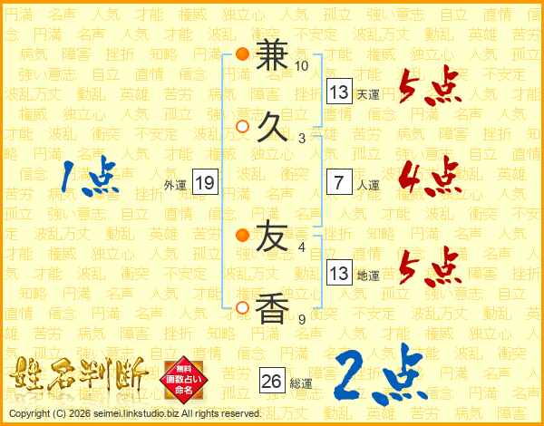 生活面を象徴する運勢です。外部から受ける影響力を表し、結婚運、家庭運や職場、環境への順応性を表します。総運から人運を引いた画数。姓や名が1文字の場合を除く。