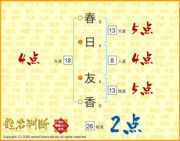 春(9画)日(4画) 友(4画)香(9画)