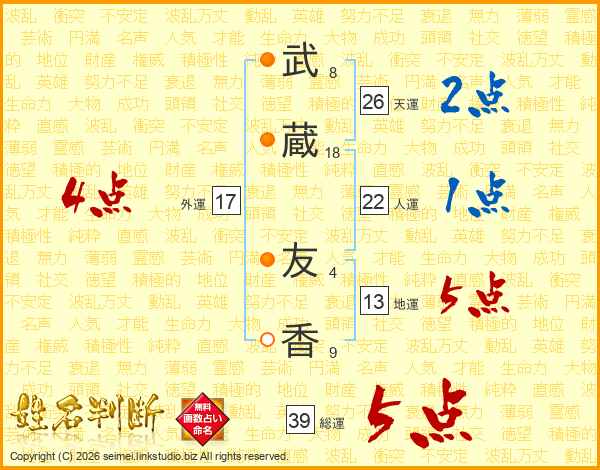 武(8画)蔵(18画) 友(4画)香(9画)