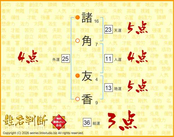 諸(16画)角(7画) 友(4画)香(9画)
