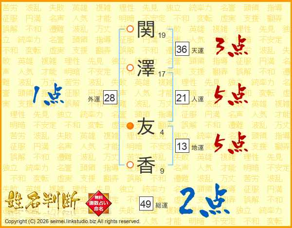 関(19画)澤(17画) 友(4画)香(9画)