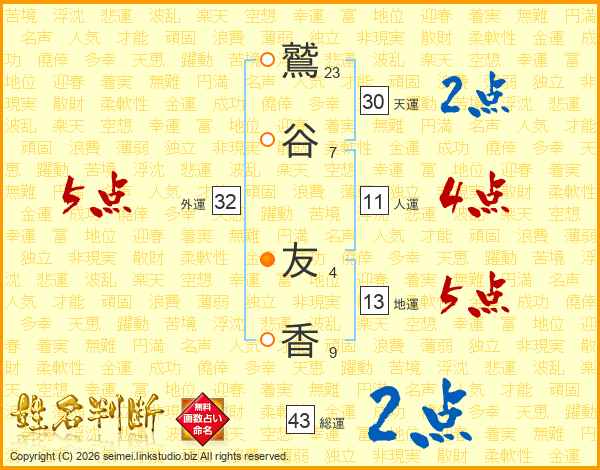 鷲谷友香さんの総運は43画の2点!