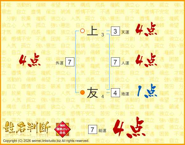 生活面を象徴する運勢です。外部から受ける影響力を表し、結婚運、家庭運や職場、環境への順応性を表します。総運から人運を引いた画数。姓や名が1文字の場合を除く。