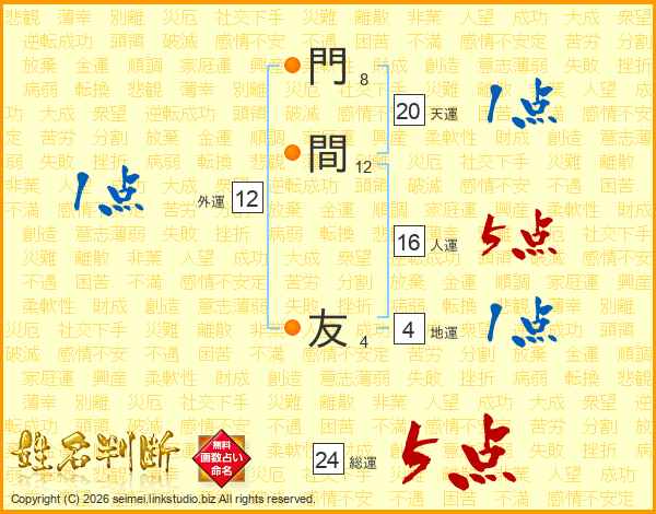 生活面を象徴する運勢です。外部から受ける影響力を表し、結婚運、家庭運や職場、環境への順応性を表します。総運から人運を引いた画数。姓や名が1文字の場合を除く。