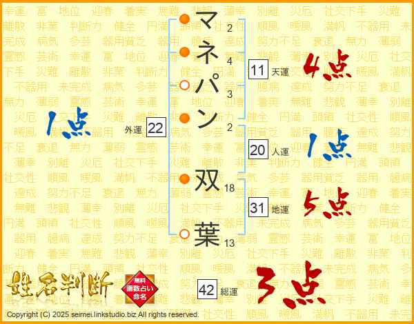 マ(2画)ネ(4画)パ(3画)ン(2画) 双(18画)葉(13画)