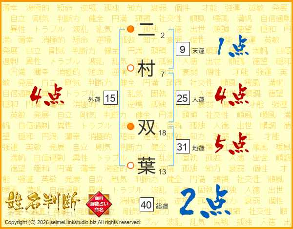 二(2画)村(7画) 双(18画)葉(13画)
