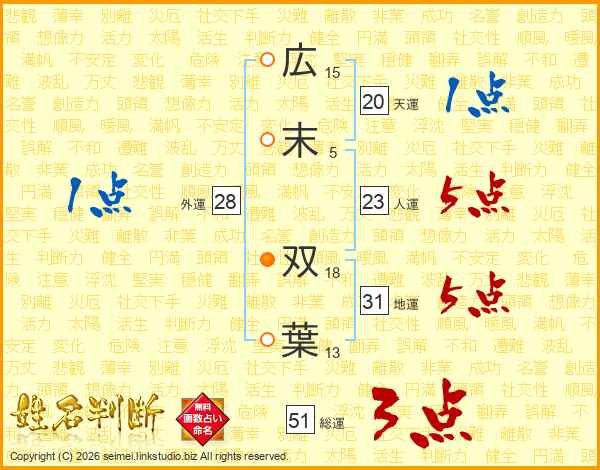 生活面を象徴する運勢です。外部から受ける影響力を表し、結婚運、家庭運や職場、環境への順応性を表します。総運から人運を引いた画数。姓や名が1文字の場合を除く。