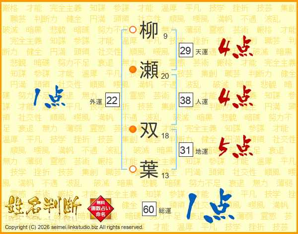 柳(9画)瀬(20画) 双(18画)葉(13画)
