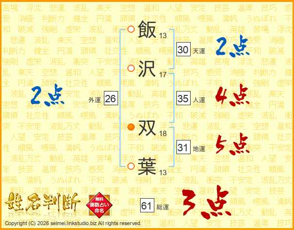 飯(13画)沢(17画) 双(18画)葉(13画)
