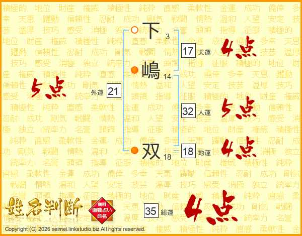 生活面を象徴する運勢です。外部から受ける影響力を表し、結婚運、家庭運や職場、環境への順応性を表します。総運から人運を引いた画数。姓や名が1文字の場合を除く。