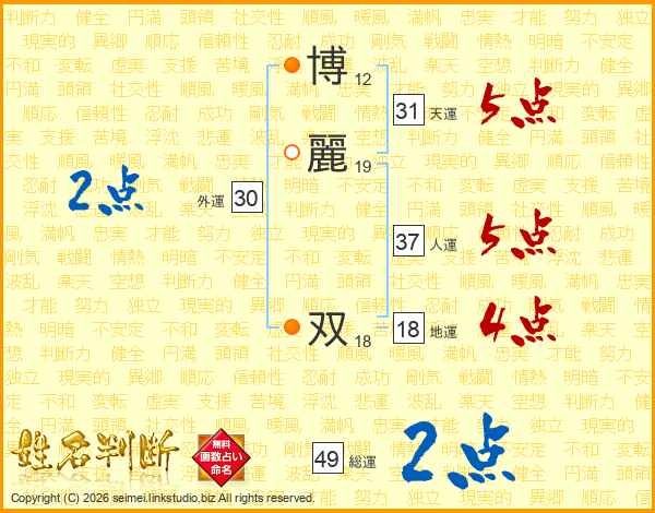 画数の奇数(○陽)と偶数(●陰)の配列で吉凶を占います。どちらかにかたよる名前は大凶名で避ける必要があります。画数の奇数偶数。