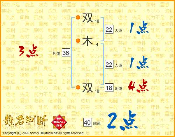 画数の奇数(○陽)と偶数(●陰)の配列で吉凶を占います。どちらかにかたよる名前は大凶名で避ける必要があります。画数の奇数偶数。