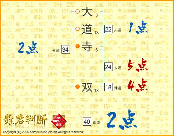 生活面を象徴する運勢です。外部から受ける影響力を表し、結婚運、家庭運や職場、環境への順応性を表します。総運から人運を引いた画数。姓や名が1文字の場合を除く。