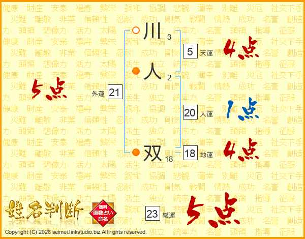 生活面を象徴する運勢です。外部から受ける影響力を表し、結婚運、家庭運や職場、環境への順応性を表します。総運から人運を引いた画数。姓や名が1文字の場合を除く。
