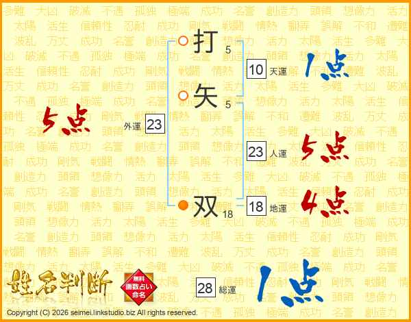 生活面を象徴する運勢です。外部から受ける影響力を表し、結婚運、家庭運や職場、環境への順応性を表します。総運から人運を引いた画数。姓や名が1文字の場合を除く。