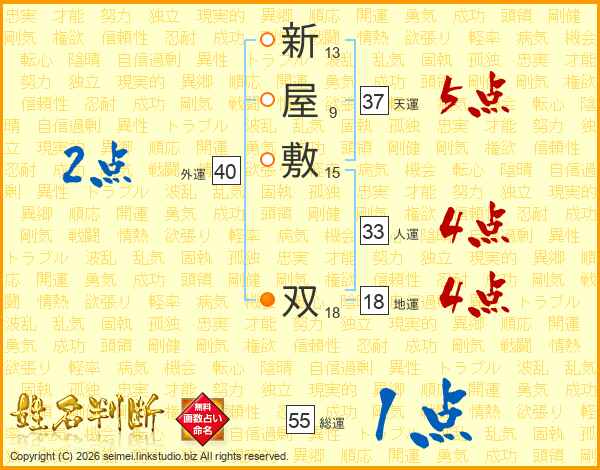 新屋敷双さんの総運は55画の1点!