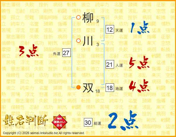 柳(9画)川(3画) 双(18画)